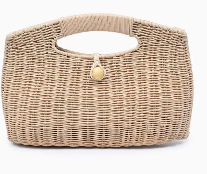 Woven straw clutch with integrated cutout handles and a wooden bead closure