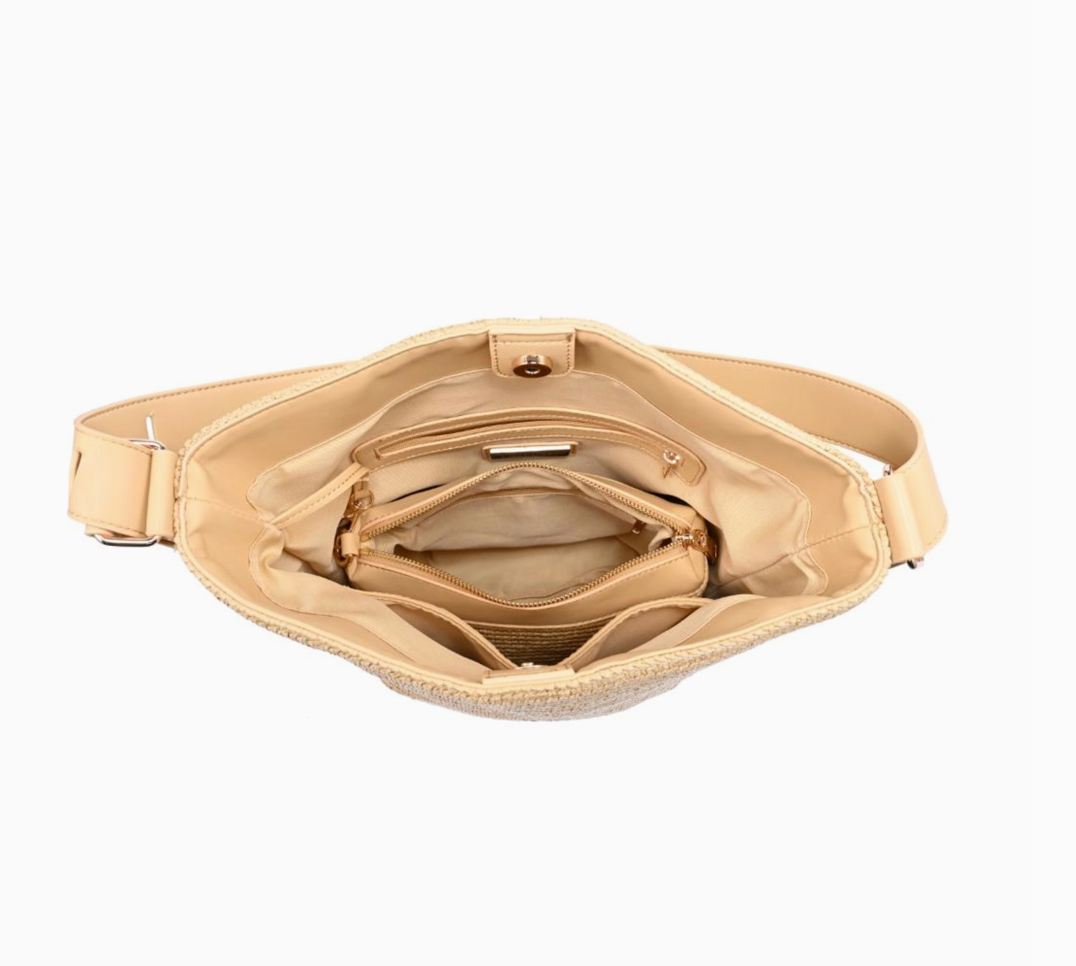 Woven bucket silhouette with a smart detachable pouch.