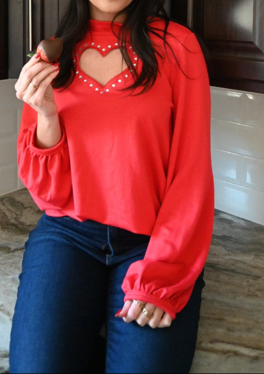 French Terry Puff Sleeved Top with Heart Cut-Out in Rhinestones and Mock Neck