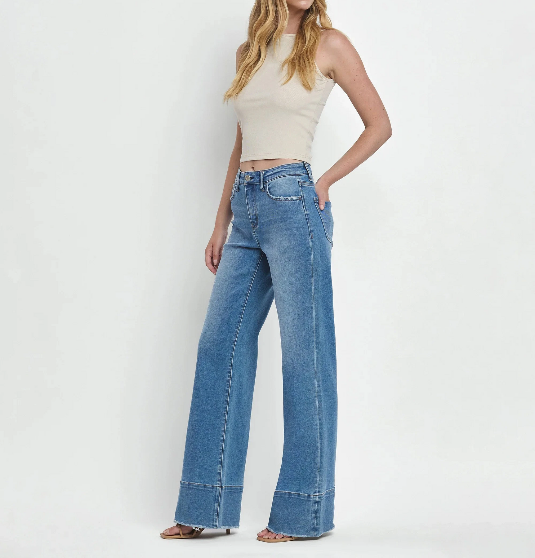HIGH RISE RAW HEM WIDE A LINE JEANS COMFORT STRETCH DENIM