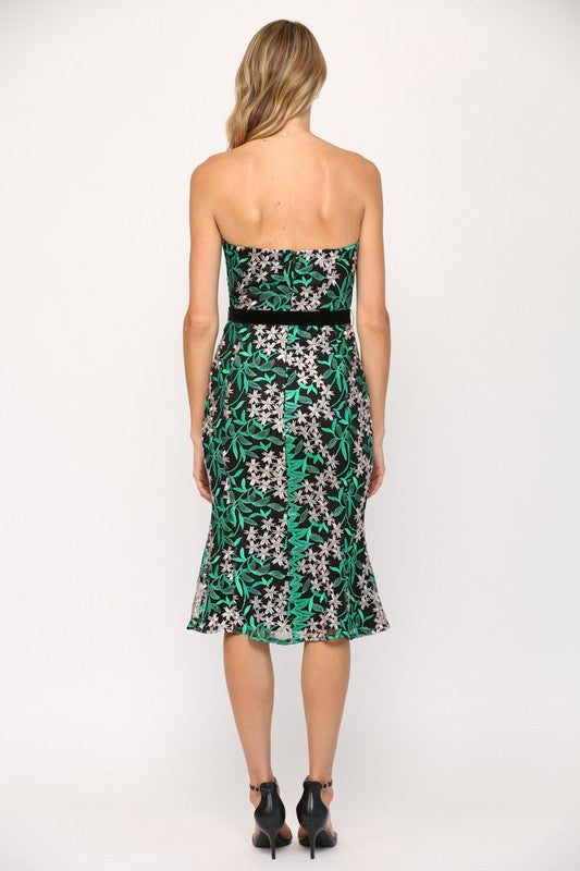MULTI EMBROIDERED STRAPLESS MIDI DRESS