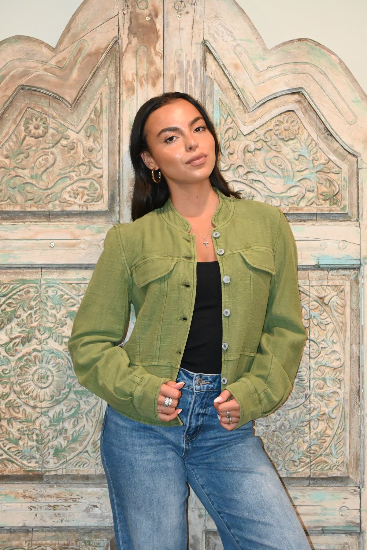 Utility-inspired with our signature twist, this flattering jacket is featured in a slim silhouette and textured cotton fabrication with a banded collar, buttons down the front, and a flared hem for a touch of femme.