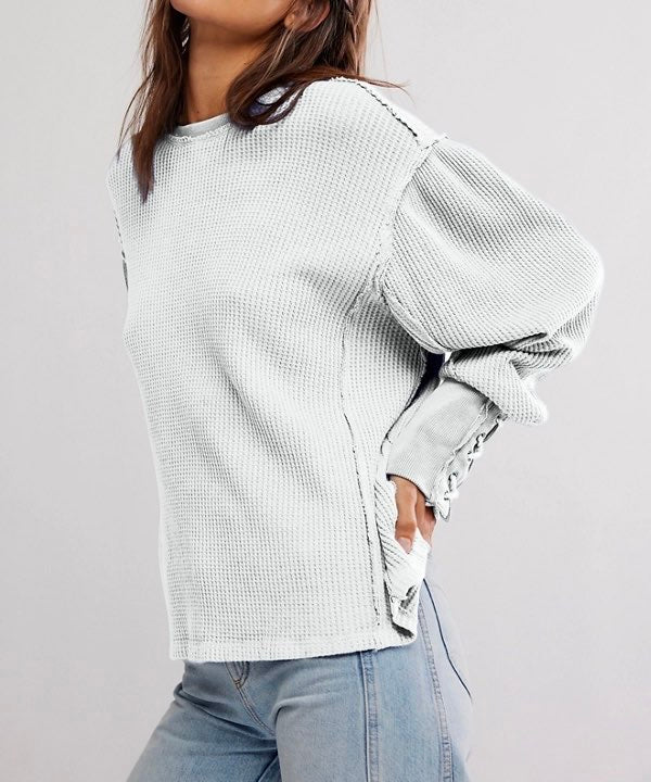 Lace-up details adorn the cuffs of this laidback long sleeve from We The Free, featured in a classic thermal fabrication with voluminous sleeves for added dimension.