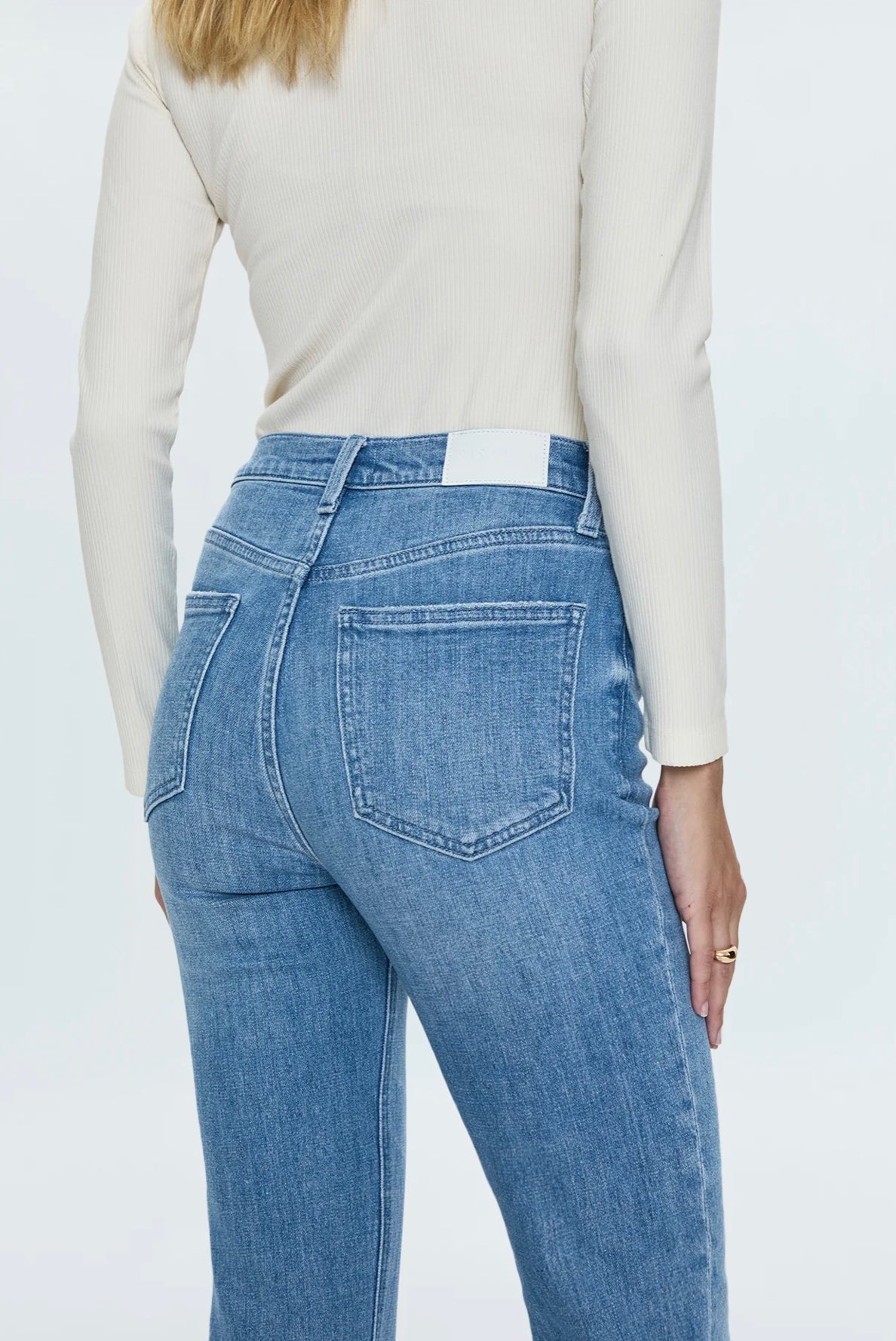 These jeans are a trendy pair of high-waisted, light-wash denim with a flattering slim fit through the thighs that gradually flares out at the bottom. They feature a classic five-pocket design and a zip-fly with a button closure. The subtle whiskering and fading details give them a slightly worn-in, vintage-inspired look. The flared hem adds a touch of retro style while making them versatile enough to pair with heels or sneakers for a chic, everyday outfit.