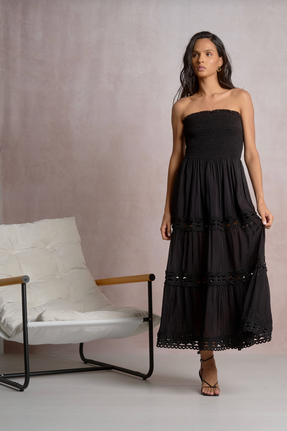 FLORAL TILE PRINT RUCHED FRONT SMOCKED MAXI DRESS