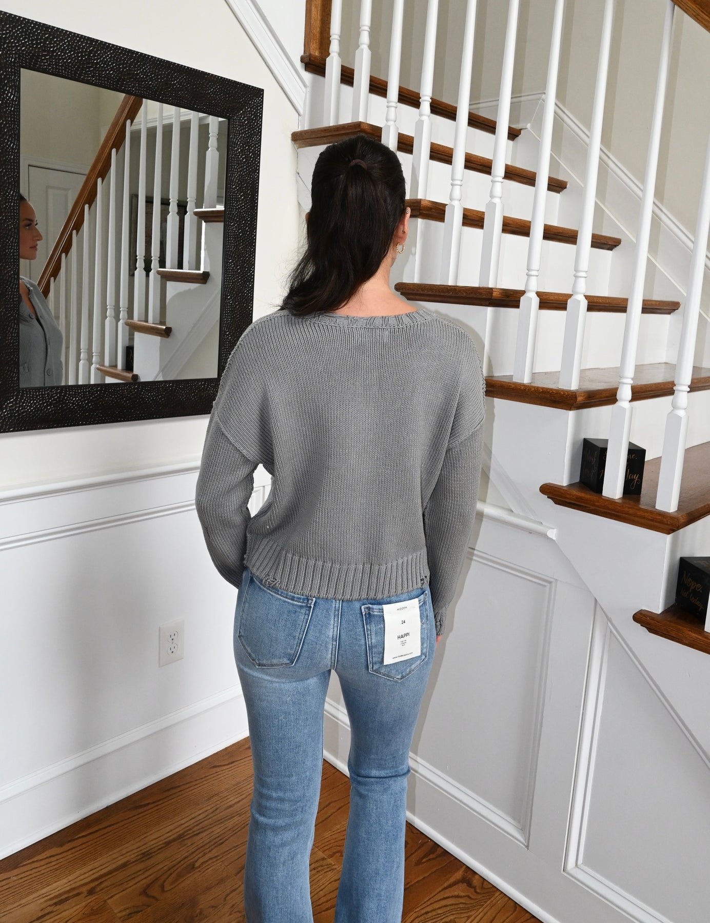 Cozy meets cool- this slouchy grey cardigan is the ultimate throw-on-and-go piece, with chunky ribbed trim, easy front buttons, and just the right amount of oversized charm.