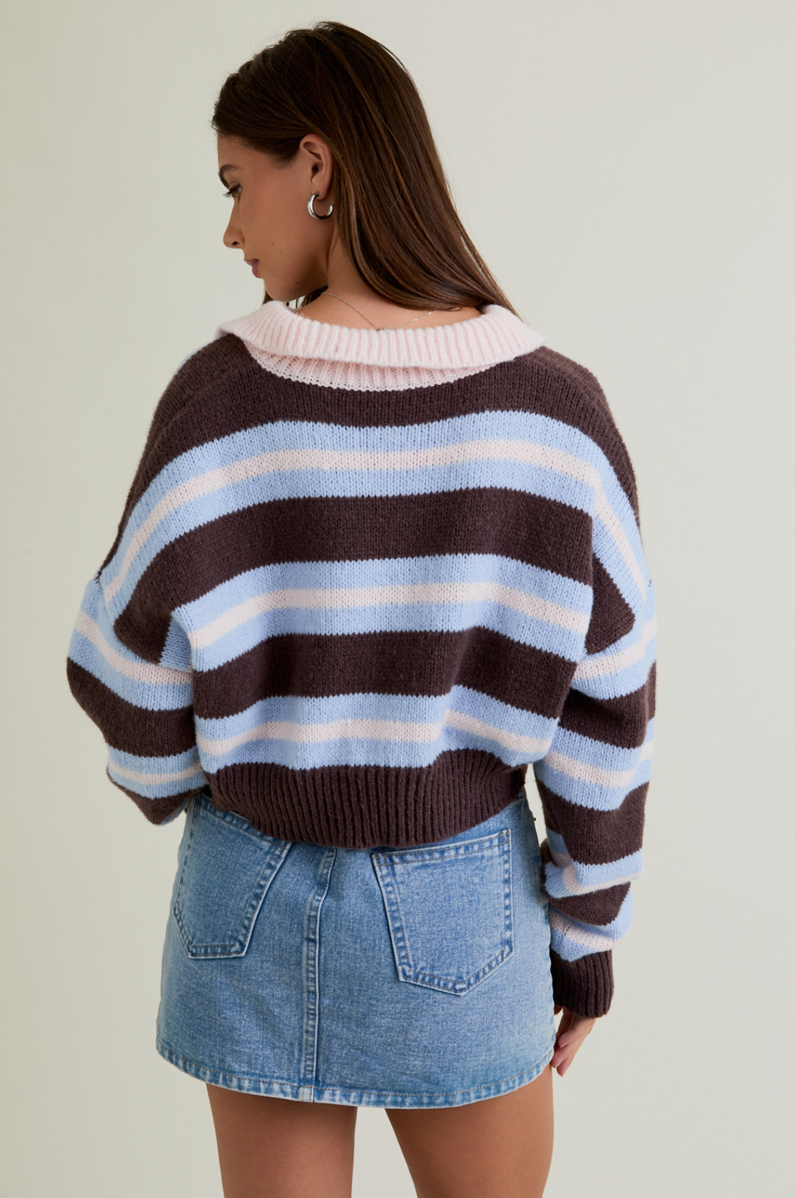 This cozy cropped knit top features bold horizontal stripes in chocolate brown, pastel blue, and light pink. It has a soft pink ribbed collar with a partial button-down front and dropped shoulders for a relaxed, vintage-inspired fit. Perfect for casual, laid-back styling with high-waisted jeans or a denim skirt.