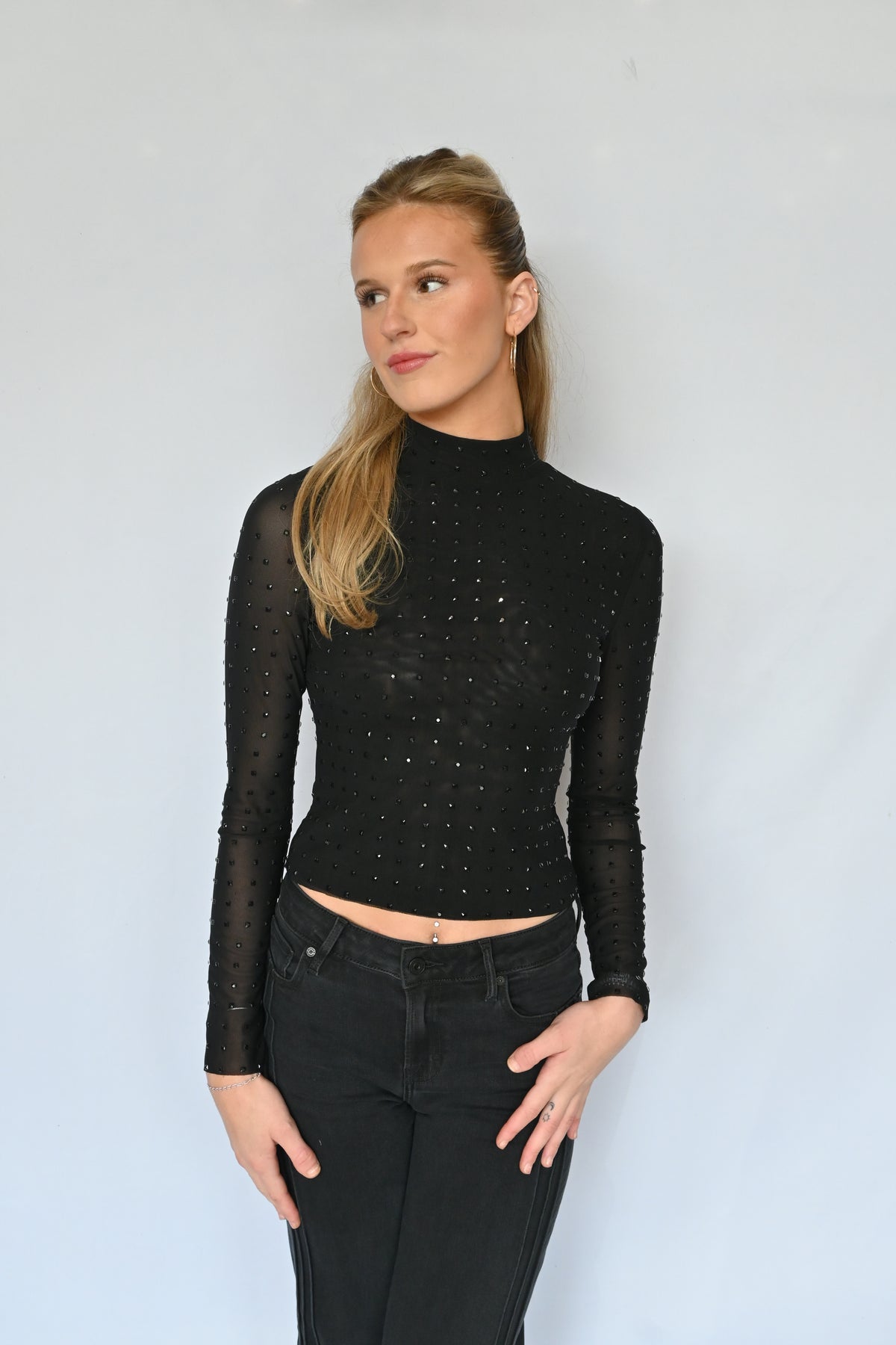 Shine bright and stay chic in this glam turtleneck mesh top, lined for comfort and decked out with dazzling square embellishments for a bold modern shimmer.