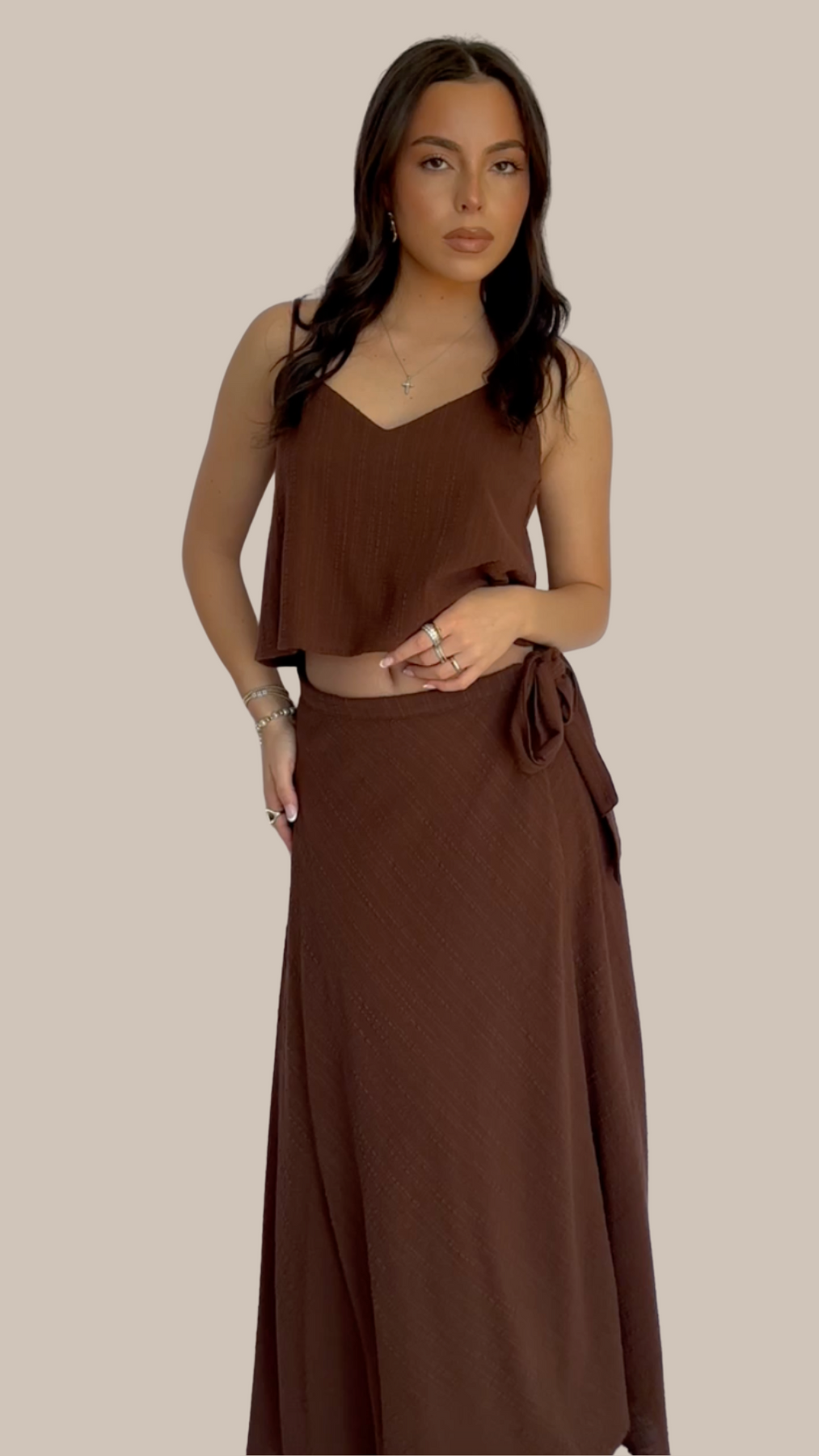 - This top is a stylish and feminine piece. It features a delicate V-neckline with thin spaghetti straps, giving it a soft and elegant touch. The fabric has a subtle textured pattern, adding depth and visual interest. The design includes a relaxed, cropped overlay that drapes beautifully, creating a layered effect. This versatile top can be paired effortlessly with skirts, trousers, or shorts for a chic and sophisticated look.