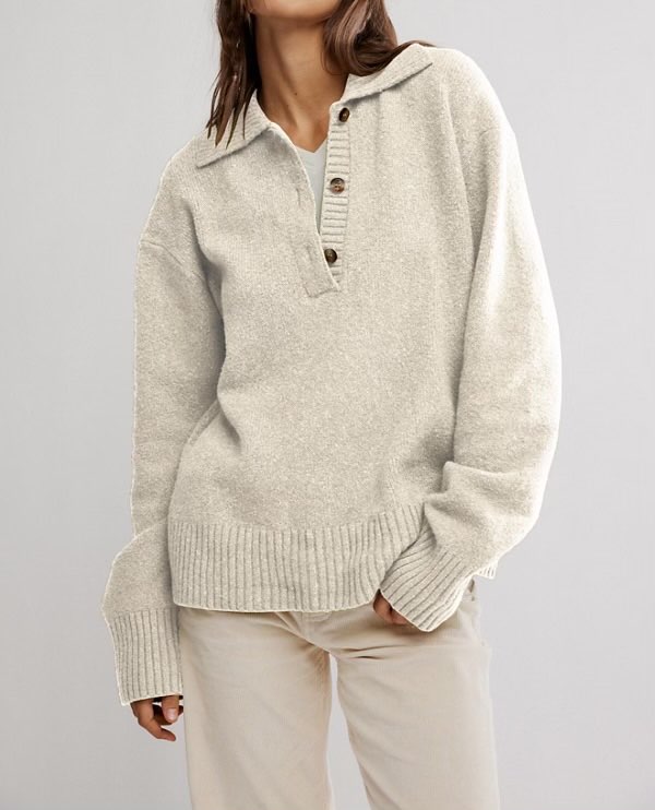 The definition of cozy, this sweater features a classic polo-inspired silhouette, a cotton-blend knit fabrication, and charming tortoise shell buttons.