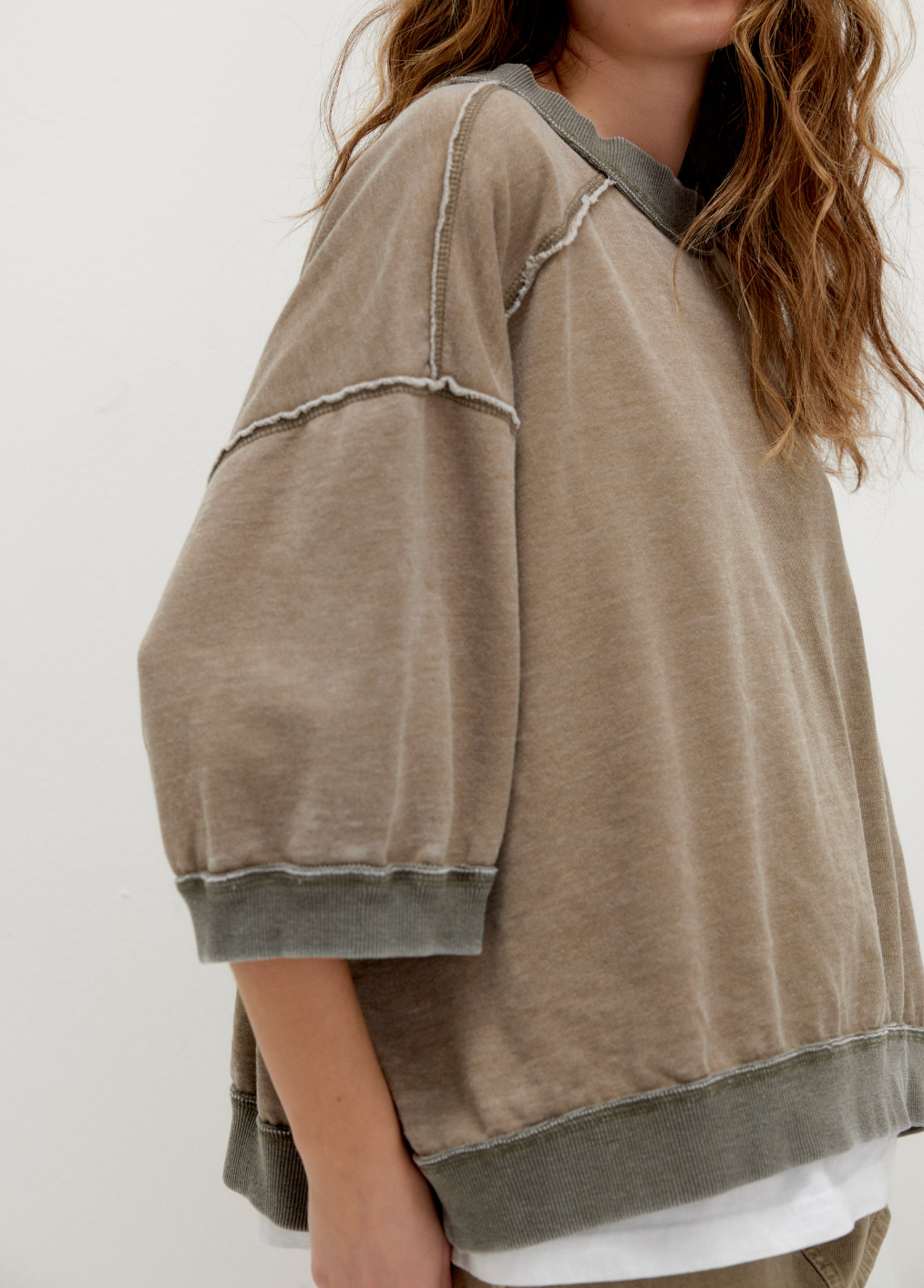 Features: Washed burnout fleece fabrication, crew neckline, drop-shoulder ¾ length sleeves, exposed seams, ribbed trims